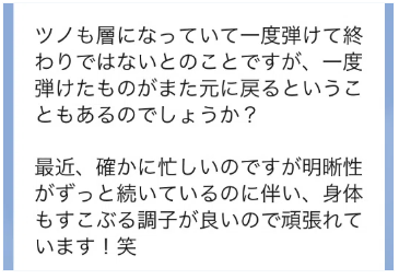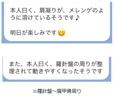 肩凝りが「メレンゲのように溶け」、肩甲骨周りの可動域の拡がりを感じていただけたとのこと。