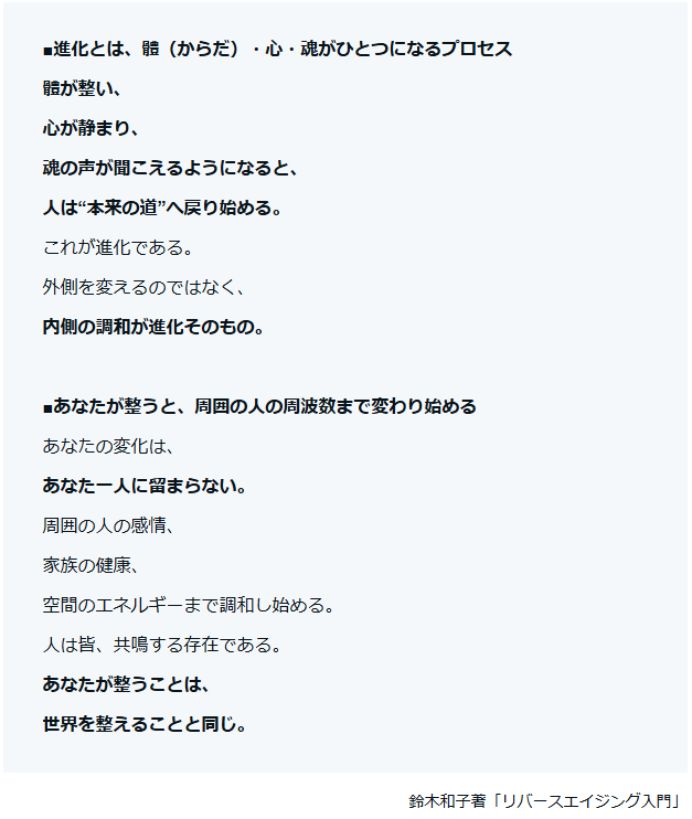 「世界の平和は私の平和から」とするホ・オポノポノ等とも共通する、宇宙の法則と心身との繋がりが実に滑らかです。我々は真にどこまでも一なる存在。