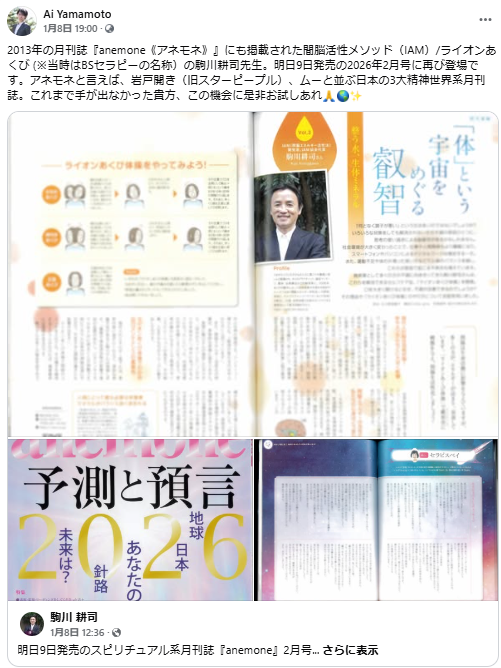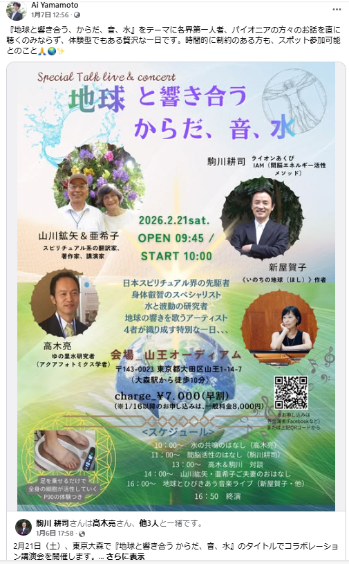 FacebookMeta)の方からシェアさせて頂いておりますが、2026221日(土)、東京大森で「地球と響き合う からだ、音、水」のテーマでIAM開発者・駒川耕司先生のコラボレーション講演会が開催される他