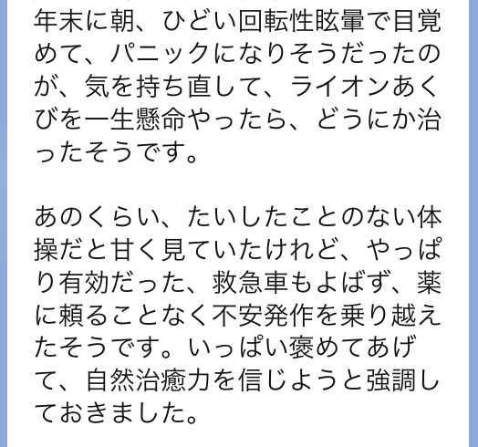 起きた発作をライオンあくびだけで鎮めたことはもちろん素晴らしいと思う一方、その前のパニックに陥りそうになった時点で、気を持ち直し、“ライオンあくび”を、と思う心の余裕をお持ちであったことにも拍手を送らせていただきたいです。その時点で既に勝負あったのだと強く思います。