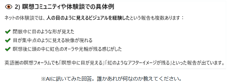 余談ですが、瞑想(座ってする)すると必ず大きな人の目が現れて、