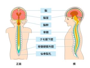 ※硬膜(こうまく)は、脳から背骨の中(脊柱管)を通って、仙骨(仙椎第2レベル)の高さまで連続して脊髄を包んでいます。